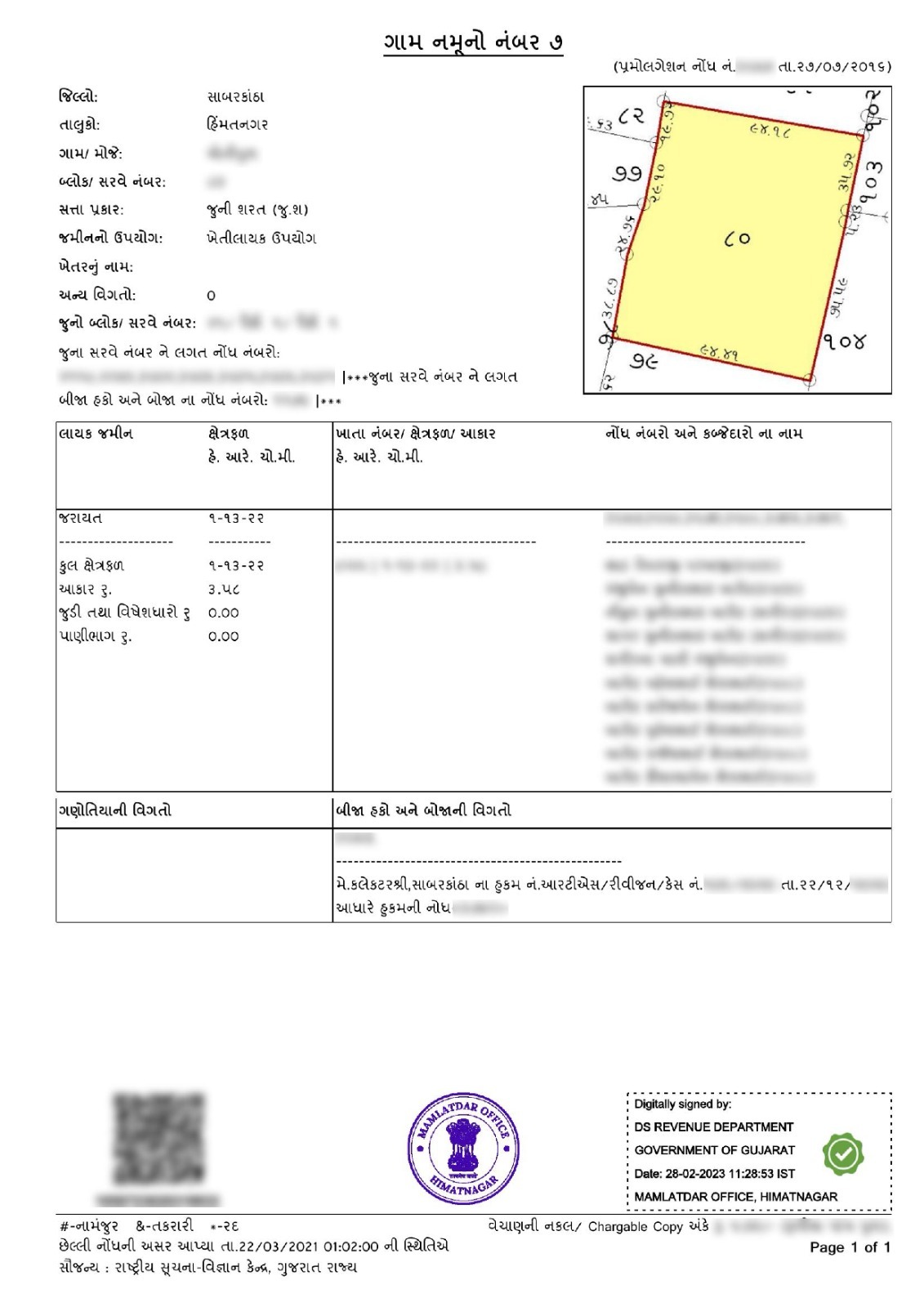 Current owner's name, precise survey number, total area, and any active bank loans or government restrictions (like "New Tenure").